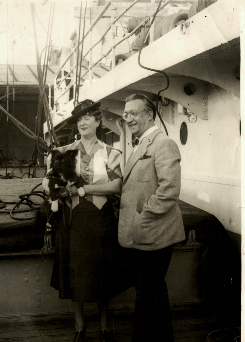 Vittorio e Lia Podrecca col loro cane vicino a una nave